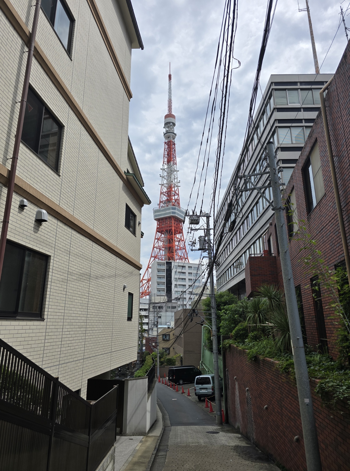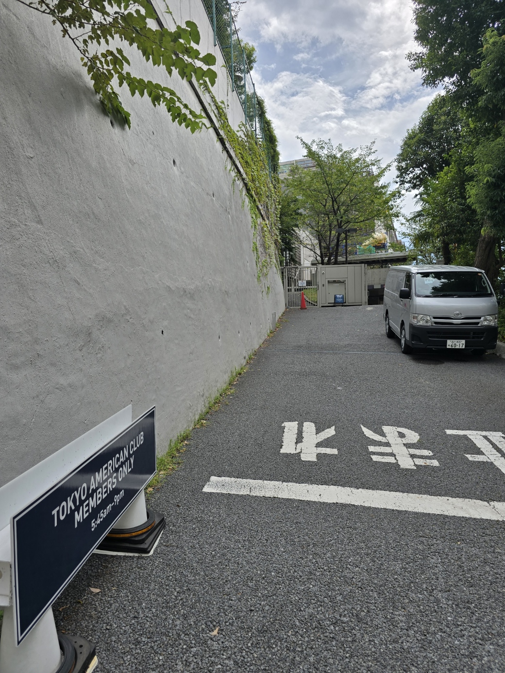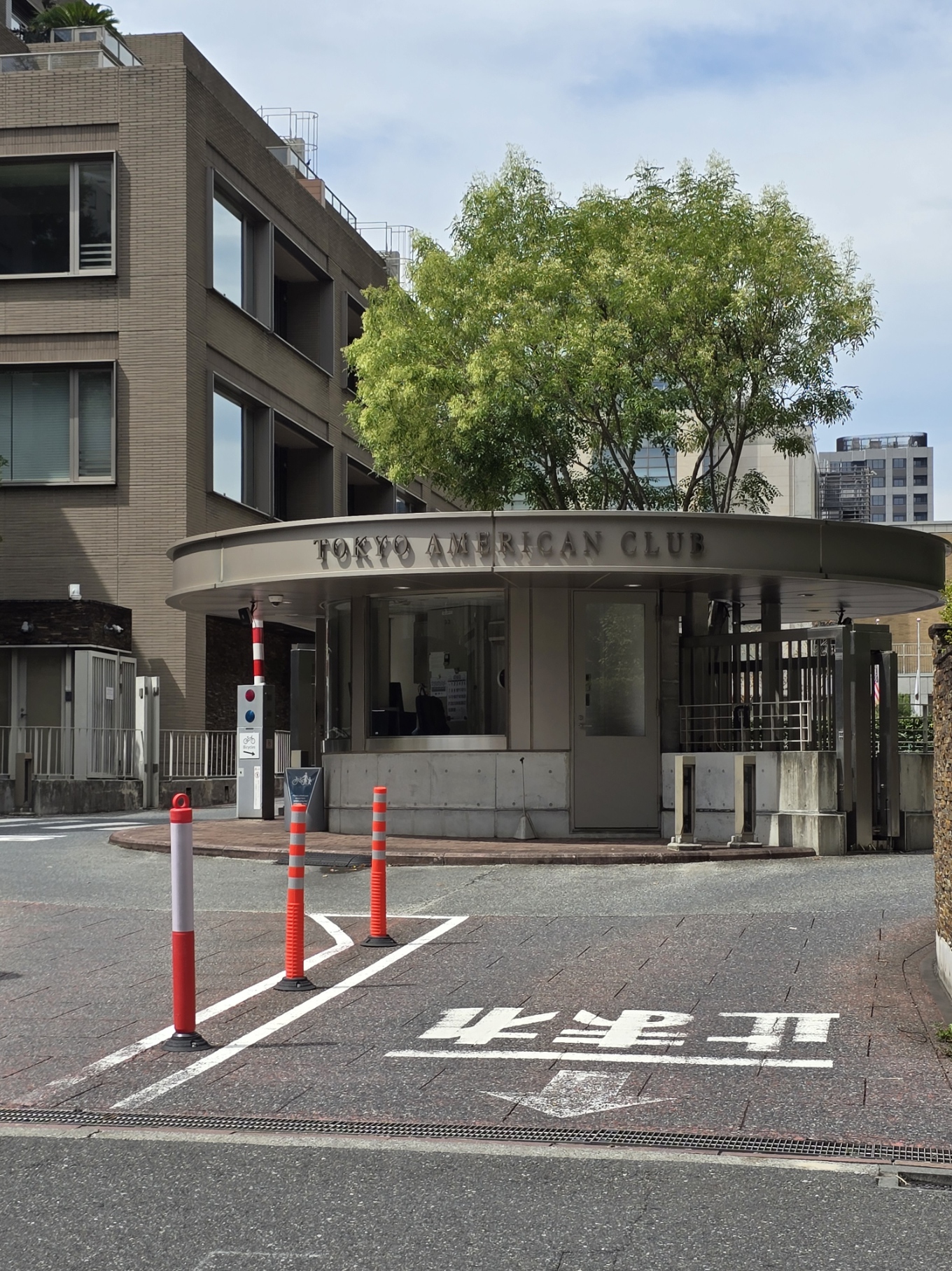 飯倉交差点から、ロシア大使館にむかう手前の路地を曲がりますと二つぐらいお寺があり、間の路地から東京タワーが見えて、その奥に東京アメリカンクラブの正門があります。