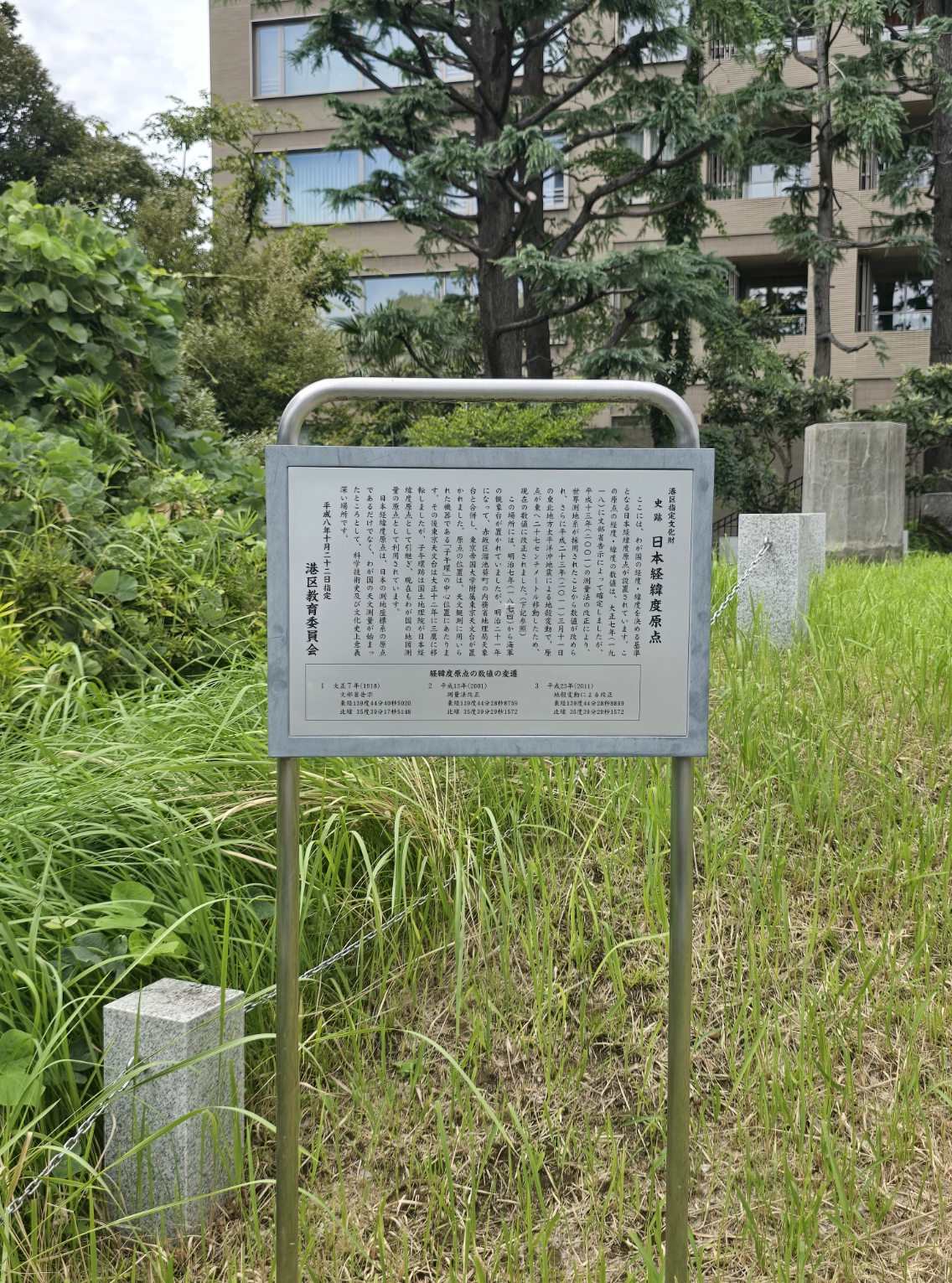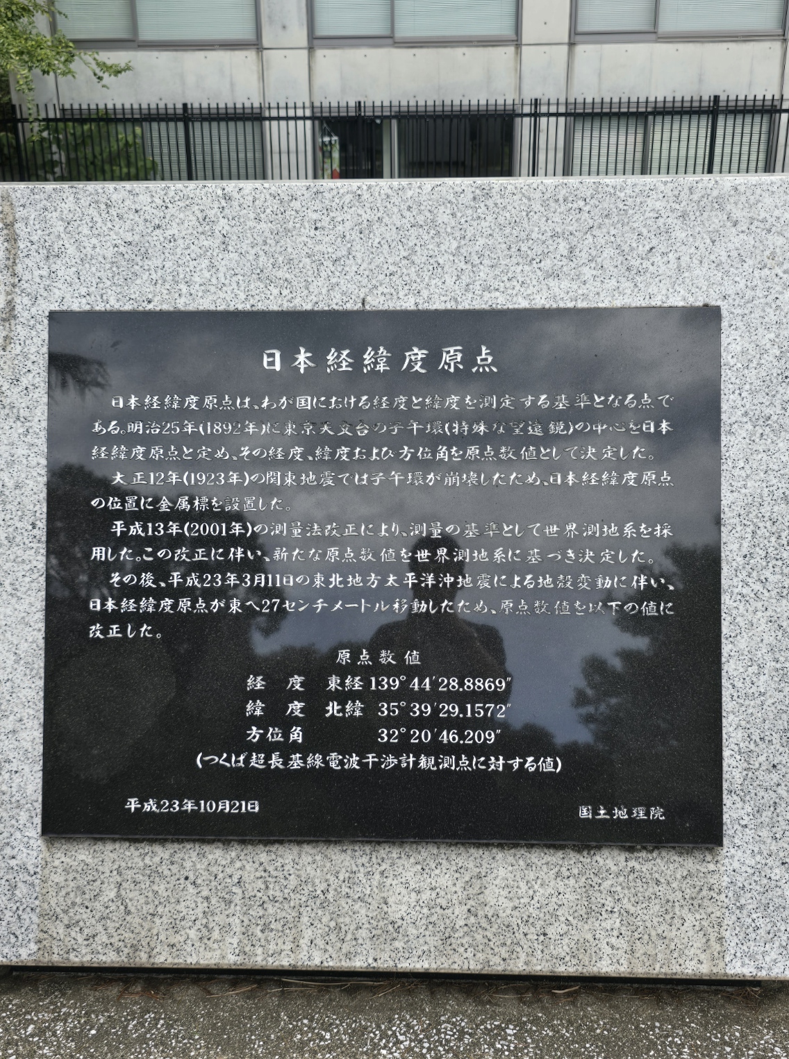 日本経緯度原点は、日本における地理学的経緯度を決めるための基準となる点であり、測量法施行令(昭和24年政令第322号)第2条第1項において、その数値が定められています。そして、ロシア大使館と東京アメリカンクラブのさらに奥に進むと日本経緯度原点があります。日本国内の測量の基準点で東京都港区麻布台二丁目に位置します。国土地理院ホームページ参照